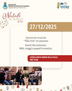 Nell’ambito del programma “Natale al Borgo 2025”, il Comune di Monte San Giovanni Campano propone un appuntamento musicale di particolare suggestione: il concerto del Filia Trio, in programma sabato 27 dicembre 2025, alle ore 19:00, presso la Chiesa Santa Maria della Valle in Piazza Marconi.